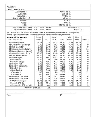 我們的安瓶機(jī)還備有在線攝像的尺寸和外觀檢測系統(tǒng),可同時檢測到安瓶的所有缺陷,對安瓶百分百檢測,通過檢測的安瓶保證百分之百是合格的,該生產(chǎn)線還裝有生產(chǎn)信息的記錄系統(tǒng),自動生成產(chǎn)品的檢驗(yàn)報告